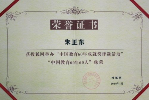 2010年1月31日,搜狐2009教育年度盛典暨中国教育60年成就奖颁奖典礼在北京隆重召开。全国各地的数百家教育机构和风云教育人物接受了网友和专家评委的评判。在这次评选中,正保远程教育董事长、总裁兼CEO朱正东先生获“中国教育60年60人”荣誉。